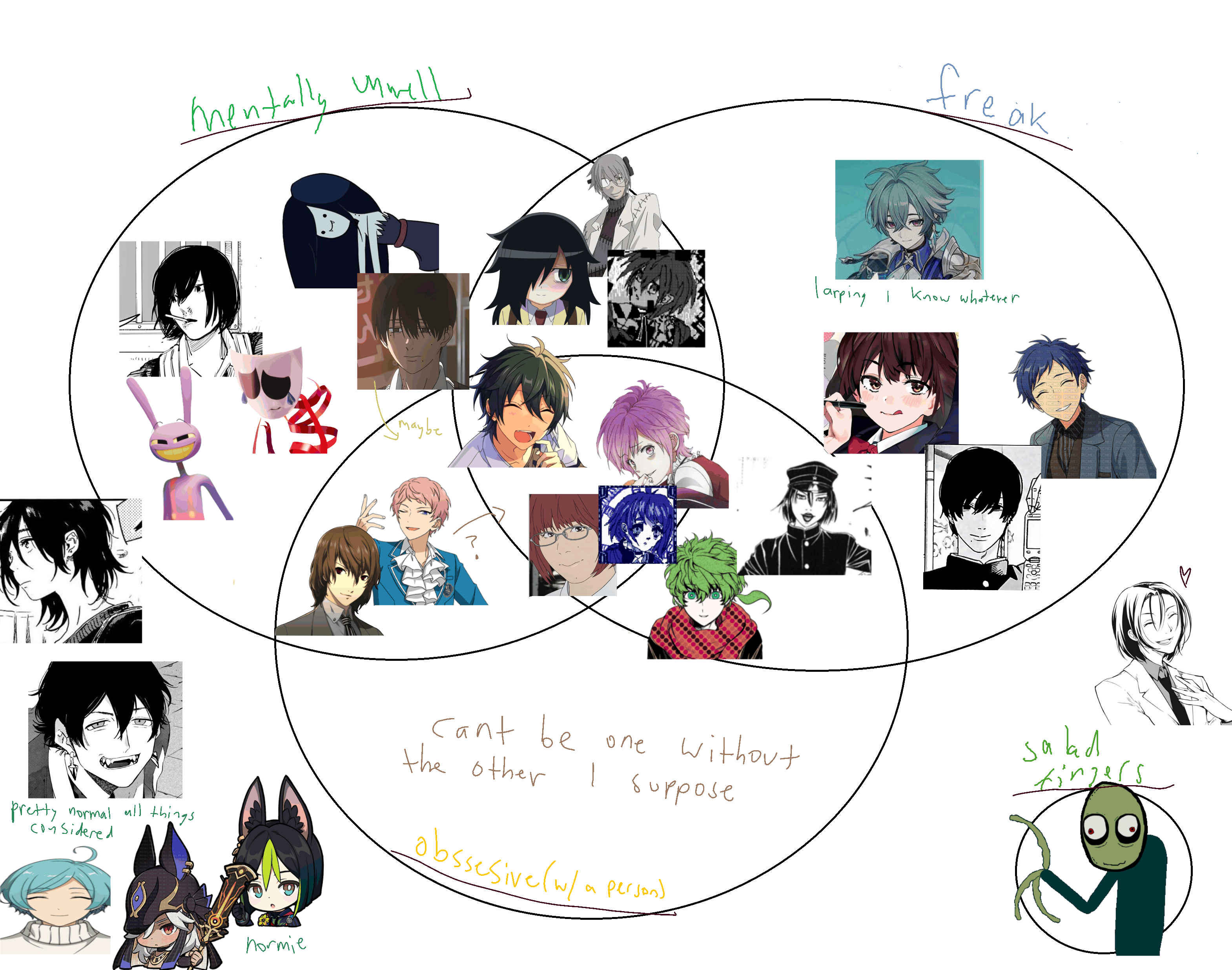 I also probably shouldve put Jaibo into the middle probably. And Midori Im not entirely sure if he belongs in the freak category Well he is a freak but Mmm not quite the same type of freak I was thinking about. And yoshida Is more towards the normie side of freak. Also maybe I should've put Murai into the mentally unwell category? Idkkkmmm. Oh and Mori Ougai, he doesnt really fit into any of the labels, he's just morally grey and a sexy doctor mafia boss who pretends to be a pedo.